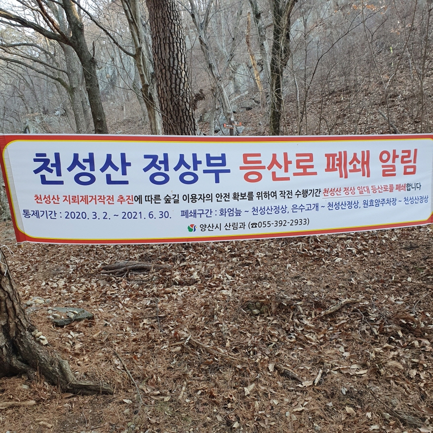 2020년 3월 2일부터 2021년 6월 30일까지 천성산 지뢰제거 작전에 따라 등산로가 폐쇄상태입니다. 내원사 옆 등산로 입구에 등산로 폐쇄 플래카드가 붙어있으며, 폐쇄구간은 화엄늪~천성산 정상, 천성산 정상과 2봉 사이에 있는 은수 고개~천성산 정상, 원효암 주차장~천성산 정상 구간입니다.